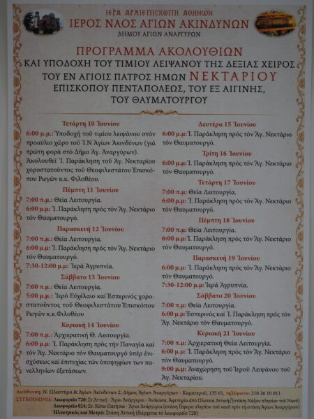 Στον Ιερό Ενοριακό Ναό Αγίων Ακινδύνων του Δήμου Αγίων Αναργύρων Αττικής τίθεται σε προσκύνηση και προς ευλογία των πιστών, έως και την Κυριακή 21 Ιουνίου ε.ε. (ώρα 21:00 ), τιμίο λείψανο της Δεξιάς Χειρός του Αγίου Νεκταρίου Επισκόπου Πενταπόλεως του Θαυματουργού.