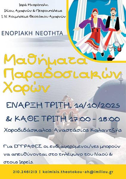 Στην ενορία Κοιμήσεως της Θεοτόκου Αχαρνών, τα μαθήματα παραδοσιακών χορών δεν είναι απλώς μια ευκαιρία για διασκέδαση· είναι ένας ζωντανός τρόπος να κρατάμε τις ρίζες μας αναμμένες, να μεταδίδουμε την πολιτιστική μας κληρονομιά και να καλλιεργούμε το πνεύμα της κοινότητας μέσα στους νέους.