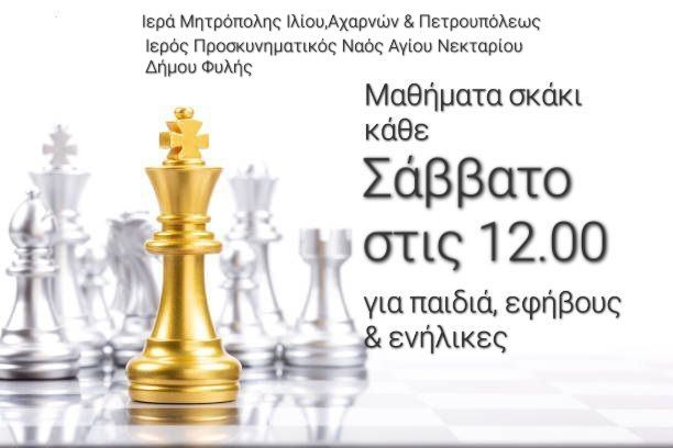 Στον Ιερό Προσκυνηματικό Ναό Αγίου Νεκταρίου στα Άνω Λιόσια παραδίδονται μαθήματα σκακιού κάθε Σάββατο στις 12:00, για παιδιά, εφήβους και ενήλικες.