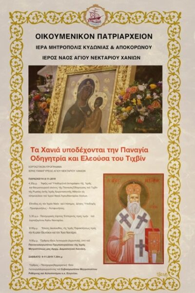 EOΡΤΑΣΤΙΚΟΝ ΠΡΟΓΡΑΜΜΑ ΙΕΡΑΣ ΠΑΝΗΓΥΡΕΩΣ ΑΓΙΟΥ ΝΕΚΤΑΡΙΟΥ ΧΑΝΙΩΝ και υποδοχή της Παναγίας Οδηγήτριας του Τιχβίν εκ της Ιεράς Αρχιεπικοπής Αθηνών.