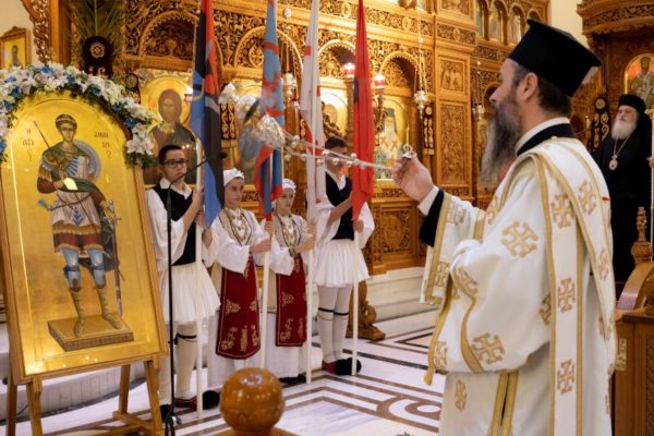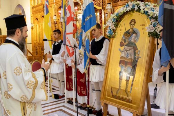 Στη σύντομη και μεστή πνευματικών και πατριωτικών μηνυμάτων ομιλία του, ο Θεοφιλέστατος αναφέρθηκε στην προσωπικότητα του Αγίου Δημητρίου, στην ανεκτίμητη προσφορά του προς το γένος μας και στην ολοζώντανη και θαυματουργό παρουσία του στη ζωή του κάθε πιστού.