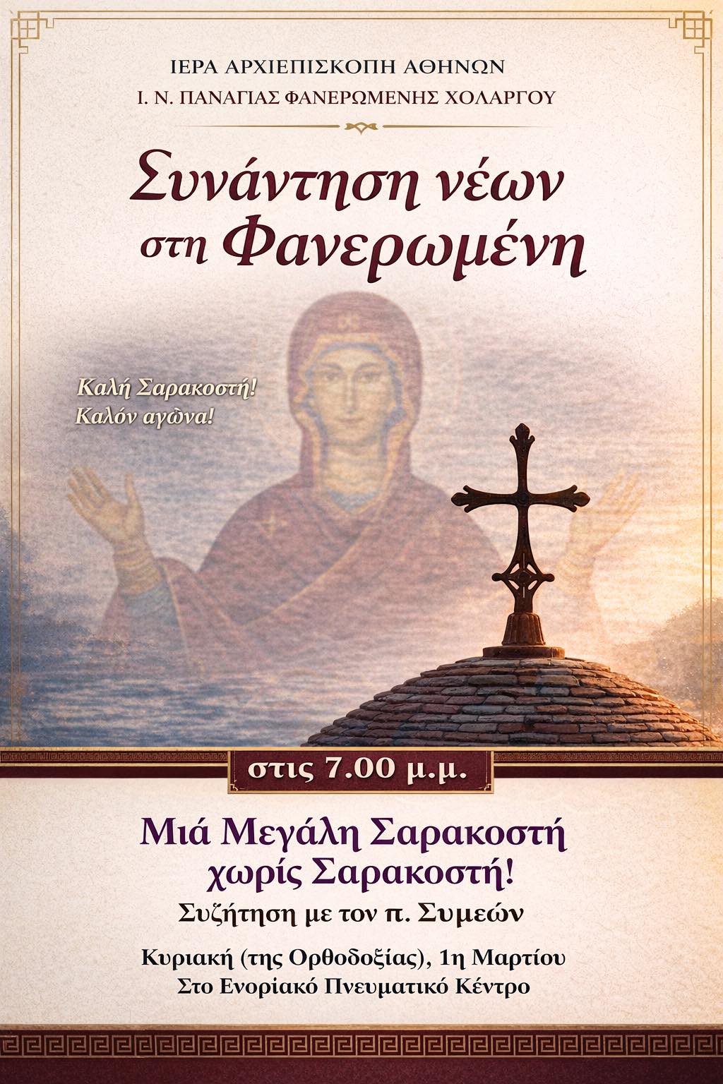 «Μιά Μεγάλη Σαρακοστή χωρίς Σαρακοστή!» είναι το θέμα της συζήτησης στη «Συνάντηση νέων στη Φανερωμένη». Πρόκειται για ενδιαφέρουσες συνάξεις φοιτητών, φοιτητριών και νέων επιστημόνων, που πραγματοποιούνται στην ενορία Παναγίας Φανερωμένης Χολαργού.