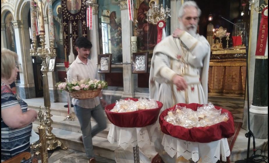 Ακολούθως διάβασε τη σχετική ”ευλογία ανθέων” από το Ευχολόγιο της Εκκλησίας μας, μοιράζοντάς τα με υποδειγματική τάξη (και καρτερία από πλευράς πιστών στο τέλος), αφού πριν έψαλλαν όλοι μαζί το ”Τις Θεός μέγας” και το ”Χριστός ανέστη” υπό το χαρμόσυνο ήχο των καμπανών.