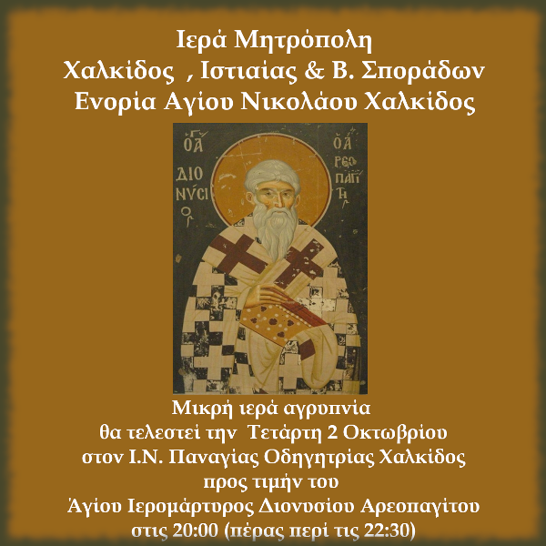 Μικρά ιερά αγρυπνία θα τελεσθεί την Τετάρτη 2 Οκτωβρίου 2019 στον Ι.Ν. Παναγίας Οδηγήτριας Χαλκίδος προς τιμήν του Αγίου Ιερομάρτυρος Διονυσίου Αρεοπαγίτου.