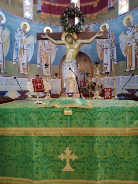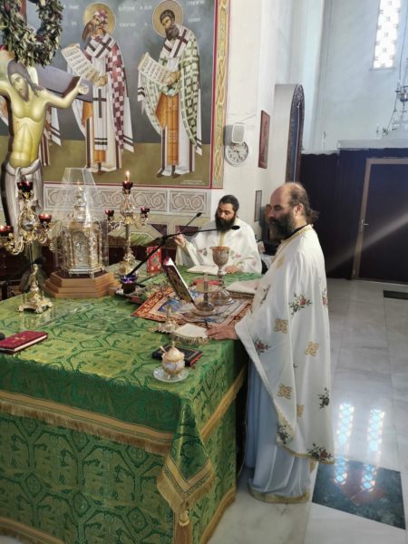 Το μυστήριο της Θείας Λειτουργίας τέλεσαν οι ιερείς του ναού, Αρχιμανδρίτης Μακάριος Τσιμέρης και ο Πρωτ. Θεοδόσιος Αργυρόπουλος.