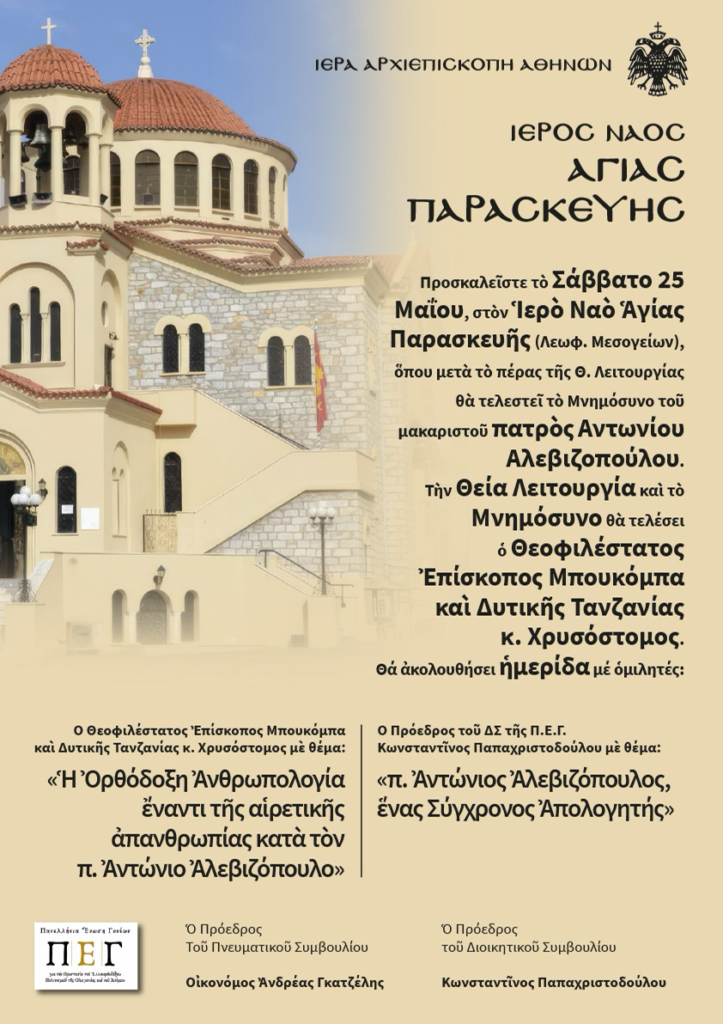 Το Μνημόσυνο του μακαριστού πατρός Αντωνίου Αλεβιζοπούλου θα τελεστεί το Σάββατο 25 Μαΐου 2024, στον Ιερό Ναό Αγίας Παρασκευής του ομωνύμου Δήμου στην Αττική (Λεωφόρος Μεσογείων), μετά το πέρας της Θείας Λειτουργίας.
