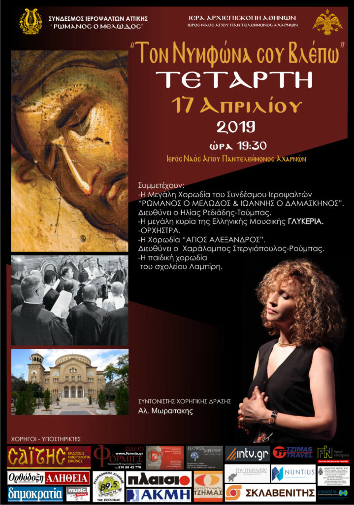 Για ακόμα μία χρονιά ο Σύνδεσμος Ιεροψαλτών Περιφέρειας Αττικής, σε συνεργασία με τον Ωδείο ΦΟΡΜΙΓΞ, θα πραγματοποιήσουν μια μοναδική μουσική εκδήλωση με τίτλο «Τον Νυμφώνα σου Βλέπω» στον Ιερό Ναό Αγίου Παντελεήμονος Αχαρνών, την «Αγία Σοφία» των Αθηνών, την Τετάρτη 17 Απριλίου και ώρα 19:00. Η σπουδαία ερμηνεύτρια Γλυκερία, παρέα με την μεγάλη χορωδία του Συνδέσμου και την χορωδία των Σχολών Λαμπίρη θα μας ταξιδέψουν στο κατανυκτικό πνεύμα της Μεγάλης Εβδομάδος. Τα έσοδα θα διατεθούν για το τεράστιο κοινωνικό-φιλανθρωπικό και πολιτιστικό έργο του μεγάλου ναού της Αθήνας.