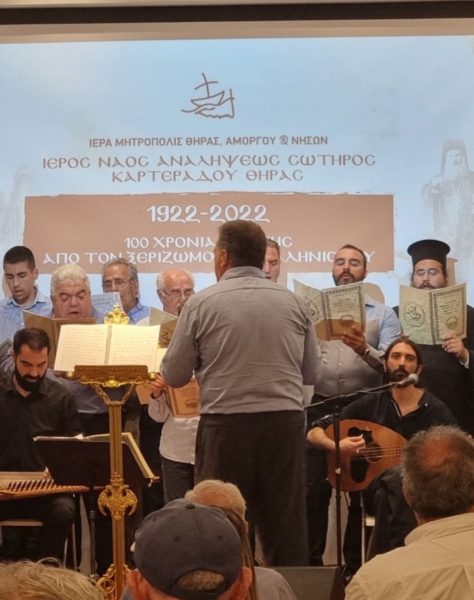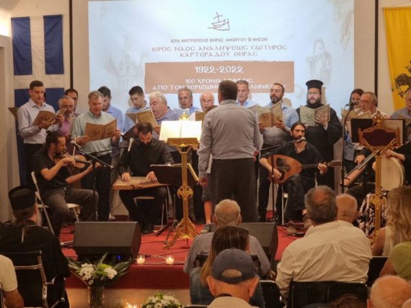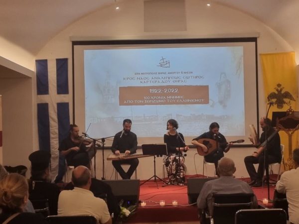 Στο πλαίσιο των εορταστικών εκδηλώσεων με αφορμή την ετήσια πανήγυρη της ενορίας του Καρτεράδου Θήρας, την Παρασκευή 3 Ιουνίου πραγματοποιήθηκε μουσική εκδήλωση μνήμης για τα 100 χρόνια από τη Μικρασιατική Καταστροφή.