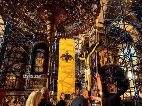 Στον Μητροπολιτικό Ιερό Ναό του Αγίου Γεωργίου στην πόλη του Ναυπλίου σε κατανυκτική ατμόσφαιρα ο Ιερέας του Ναού π. Παναγιώτης Κιντής ψάλλοντας το “σήμερον κρεμάται επί ξύλου”, περιέφερε τον εσταυρωμένο και τον τοποθέτησε στο κέντρο του Ναού, Μεγάλη Πέμπτη 2 Μαΐου 2024.