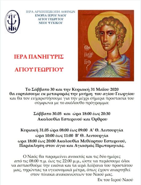 Το Σάββατο 30 και την Κυριακή 31 Μαϊου 2020, θα εορταστεί εκ μεταφοράς (λόγω της επίκαιρης εκτάκτου περιστάσεως ένεκα του Κορονοϊου) η μνήμη του Αγίου Γεωργίου στην Ενορία Ιερού Ναού Αγίου Γεωργίου Ψυχικού. Ο Ναός θα παραμείνει ανοικτός και τις δύο ημέρες από τις 08.00 έως τις 22.οο, ώστε όλοι να ασπασθούν την Ιερά Εικόνα και τα Ιερά Λείψανα του Αγίου.