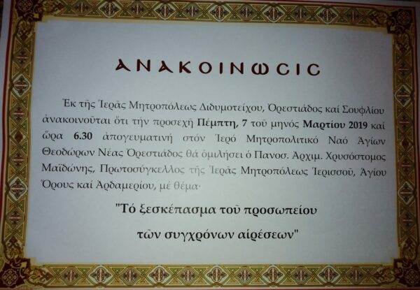 Κατά την Πέμπτη 7 Μαρτίου 2019 και ώρα 6.30 της εσπέρας, εις τον Ιερό Μητροπολιτικό Ναό Αγίων Θεοδώρων Νέας Ορεστιάδος θα ομιλήσει ο Πανοσ. Αρχιμ. Χρυσόστομος Μαϊδώνης, Πρωτοσύγκελλος της Ιεράς Μητροπόλεως Ιερισσού, Αγίου Όρους και Αρδαμερίου υπό το θέμα: “Το ξεσκέπασμα του προσωπείου των συγχρόνων αιρέσεων”.