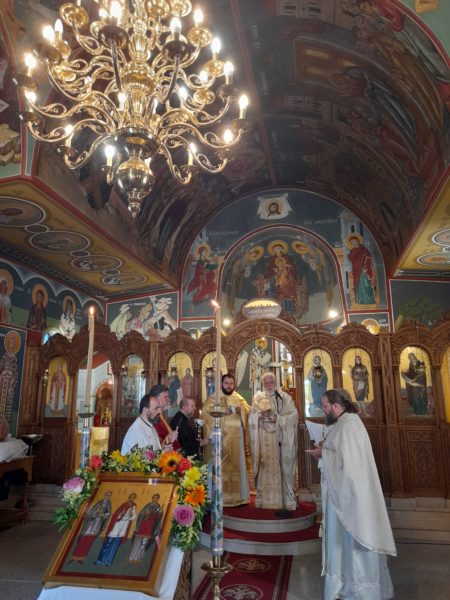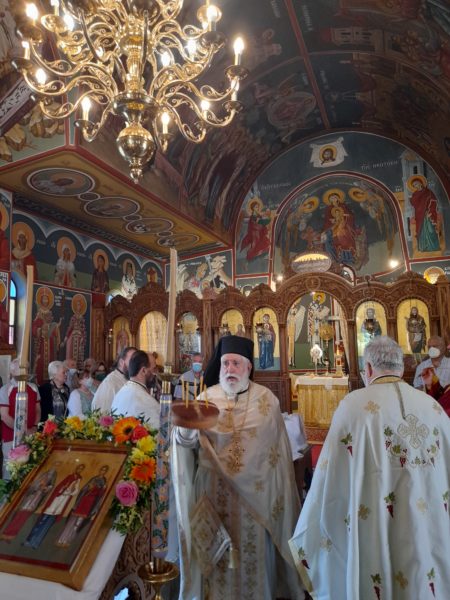Στην Πανηγυρική Θεία Λειτουργία μετ’ Αρτοκλασίας συλλειτούργησαν έξι ιερείς με προεξάρχοντα τον εκ Κεφαλληνίας Πανοσιολογιώτατο Αρχιμανδρίτη π.Νικόλαο Χαρτουλιάρη,Προϊστάμενο του Ιερού Προσκυνηματικού Ναού Παναγίας Ελευθερωτρίας Κηφισιάς (Κοκκιναρά),ο οποίος και κήρυξε τον Θείο Λόγο.