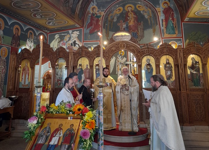 Στην Πανηγυρική Θεία Λειτουργία μετ’ Αρτοκλασίας συλλειτούργησαν έξι ιερείς με προεξάρχοντα τον εκ Κεφαλληνίας Πανοσιολογιώτατο Αρχιμανδρίτη π.Νικόλαο Χαρτουλιάρη,Προϊστάμενο του Ιερού Προσκυνηματικού Ναού Παναγίας Ελευθερωτρίας Κηφισιάς (Κοκκιναρά),ο οποίος και κήρυξε τον Θείο Λόγο.