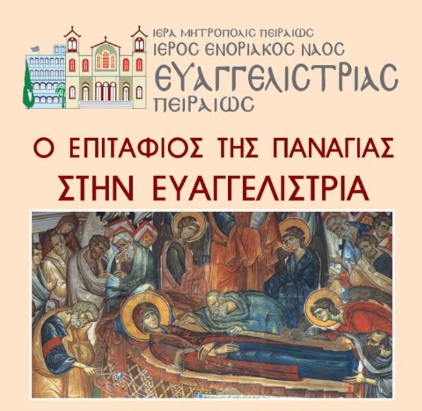 Την Τετάρτη 14 Αυγούστου 2019 και ώρα 7.00 μ.μ., θα εκκινήσει Μέγας Πανηγυρικός Εσπερινός και στη συνέχεια ΕΠΙΤΑΦΙΟΣ και ΕΓΚΩΜΙΑ ΤΗΣ ΥΠΕΡΑΓΙΑΣ ΘΕΟΤΟΚΟΥ, χοροστατούντος του Σεβ. Μητροπολίτου Πειραιώς, κ. Σεραφείμ.