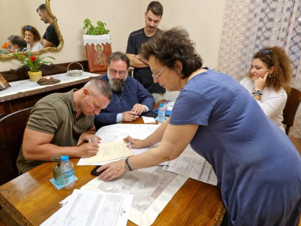 Αμέσως μετά υπογράφηκαν τα συμβόλαια, παρουσία του ταμία του εκκλησιαστικού συμβουλίου Γερασίμου Ι. Αλεξοπούλου, του επιτίμου αντιπροέδρού του, Γερασίμου Π. Αλεξοπούλου, και των συνεργατών Μαρίας -Σοφίας Σάββα, Βαρθολομαίου Σοκολόφσκι, Χρυσούλας Πετράκη και του ζεύγους Γεωργίου και Βασιλικής Τσίμπρου.