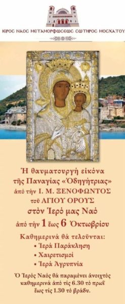 Την θαυματουργή εικόνα της Παναγίας “Οδηγήτρια” από την Ιερά Μονή Ξενοφώντος Αγίου Όρους θα υποδεχθεί την 1η Οκτωβρίου ο Ιερός Ναός Μεταμορφώσεως του Σωτήρος Μοσχάτου.