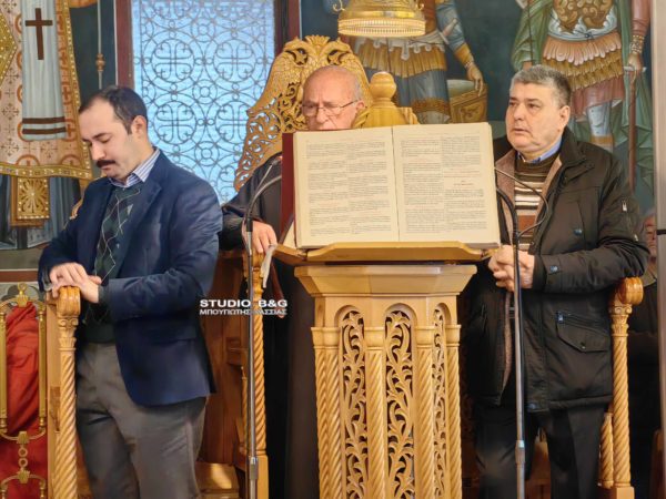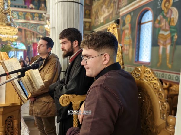 Κατά την Θεία λειτουργία έψαλλε ο Πρωτοψάλτης του Μητροπολιτικού Ιερού Ναού Αγίου Γεωργίου Ναυπλίου και Πρόεδρος του Συνδέσμου Ιεροψαλτών Αργολίδας, Δημήτριος Καρκαλάτος.