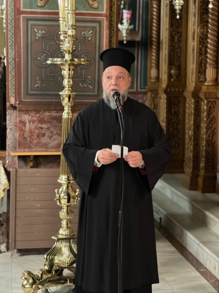 Τον Σεβασμιώτατο παρουσίασε στους πιστούς ο Προϊστάμενος του Ιερού Ναού Πανοσιολ. Αρχιμ. π. Χριστόδουλος Κοτσίφης, ο οποίος του μετέφερε τις ευχές και τις ευχαριστίες του Σεβασμιωτάτου Μητροπολίτη Καισαριανής, Βύρωνος και Υμηττού κ. Δανιήλ για την αποδοχή της προσκλήσεώς του.