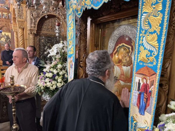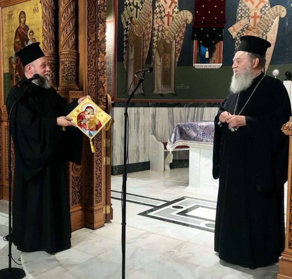Μετά την ολοκλήρωση της ομιλίας του Σεβασμιωτάτου, ο π. Χριστόδουλος προσέφερε εκ μέρους του Εκκλησιαστικού Συμβουλίου αλλά και όλης της Ενορίας, ένα επιγονάτιο στο οποίο απεικονίζεται η Παναγία η Παρηγορήτρια.