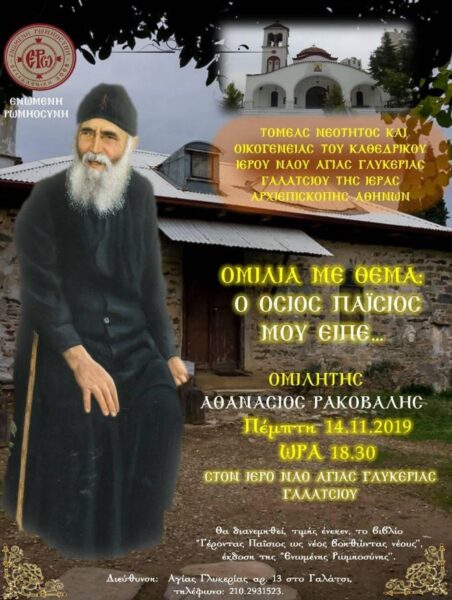 Ο τομέας Νεότητας και Οικογένειας του Ιερού Ναού Αγίας Γλυκερίας Γαλατσίου διοργανώνει την Πέμπτη 14 Νοεμβρίου 2019 ομιλία με θέμα: “Ο όσιος Παΐσιος μου είπε”. Ομιλητής θα είναι ο κ. Αθανάσιος Ρακοβαλής.