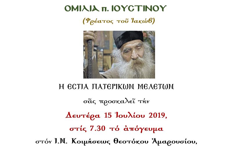 Η Εστία Πατερικών Μελετών, μάς προσκαλεί τη Δευτέρα 15 Ιουλίου 2019, στις 7.30 το απόγευμα, στον Ι.Ν. Κοιμήσεως Θεοτόκου Αμαρουσίου, με προσκεκλημένο τον διάδοχο του αγίου Φιλουμένου, φρουρό και Ηγούμενο της Ιεράς Μονής Αγίας Φωτεινής της Σαμαρείτιδος του Φρέατος του Ιακώβ, Αγιοταφίτη, π. Ιουστίνο.