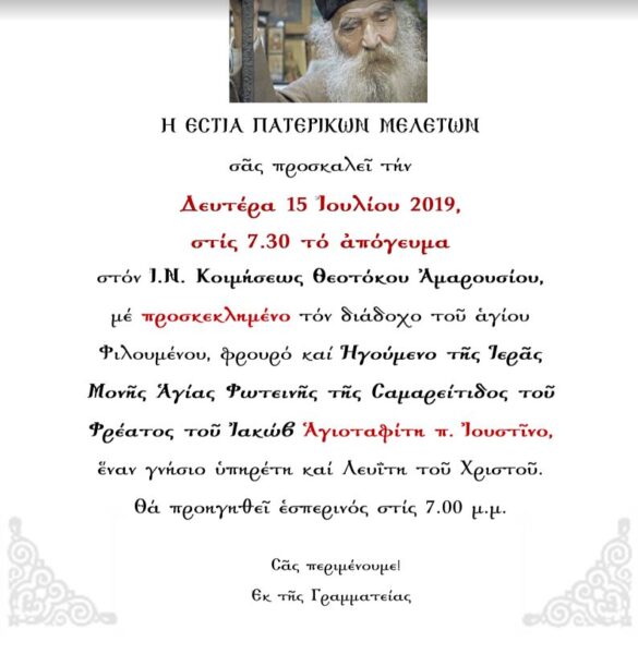 Η Εστία Πατερικών Μελετών, μάς προσκαλεί τη Δευτέρα 15 Ιουλίου 2019, στις 7.30 το απόγευμα, στον Ι.Ν. Κοιμήσεως Θεοτόκου Αμαρουσίου, με προσκεκλημένο τον διάδοχο του αγίου Φιλουμένου, φρουρό και Ηγούμενο της Ιεράς Μονής Αγίας Φωτεινής της Σαμαρείτιδος του Φρέατος του Ιακώβ, Αγιοταφίτη, π. Ιουστίνο.