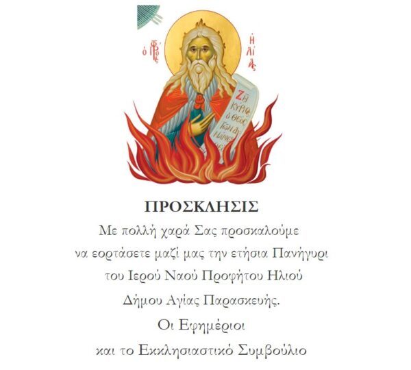 Με πολλή χαρά, η Ενορία Ιερού Ναού Προφήτου Ηλιού Αγίας Παρασκευής Αττικής, μάς προσκαλεί στην ετήσια Πανήγυρι του Ιερού Ναού, σύμφωνα με το παρακάτω Πρόγραμμα: