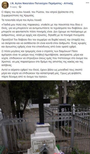 “Ο τάφος του αγίου Λουκά, του Ρώσου, του ιατρού βρίσκεται στη Συμφερούπολη της Κριμαίας” αναφέρει σε επίκαιρη ανάρτησή της η Ενορία Ι.Ν. Αγίου Νικολάου Πολιούχου Περάματος – Αττικής.