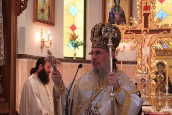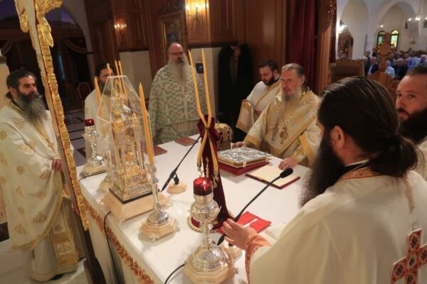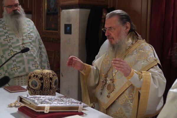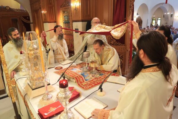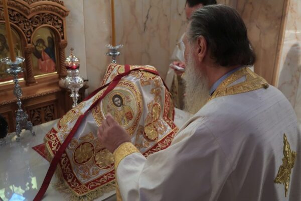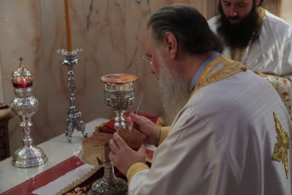 Ο Θεοφιλέστατος Επίσκοπος Θαυμακού και Καθηγούμενος της Ιεράς Μονής Ασωμάτων Πετράκη, κ. Ιάκωβος, ιερουργών, κατά την 20η Οκτωβρίου 2019, στον Ι.Ν. Αγίου Δημητρίου Ομωνύμου Δήμου.