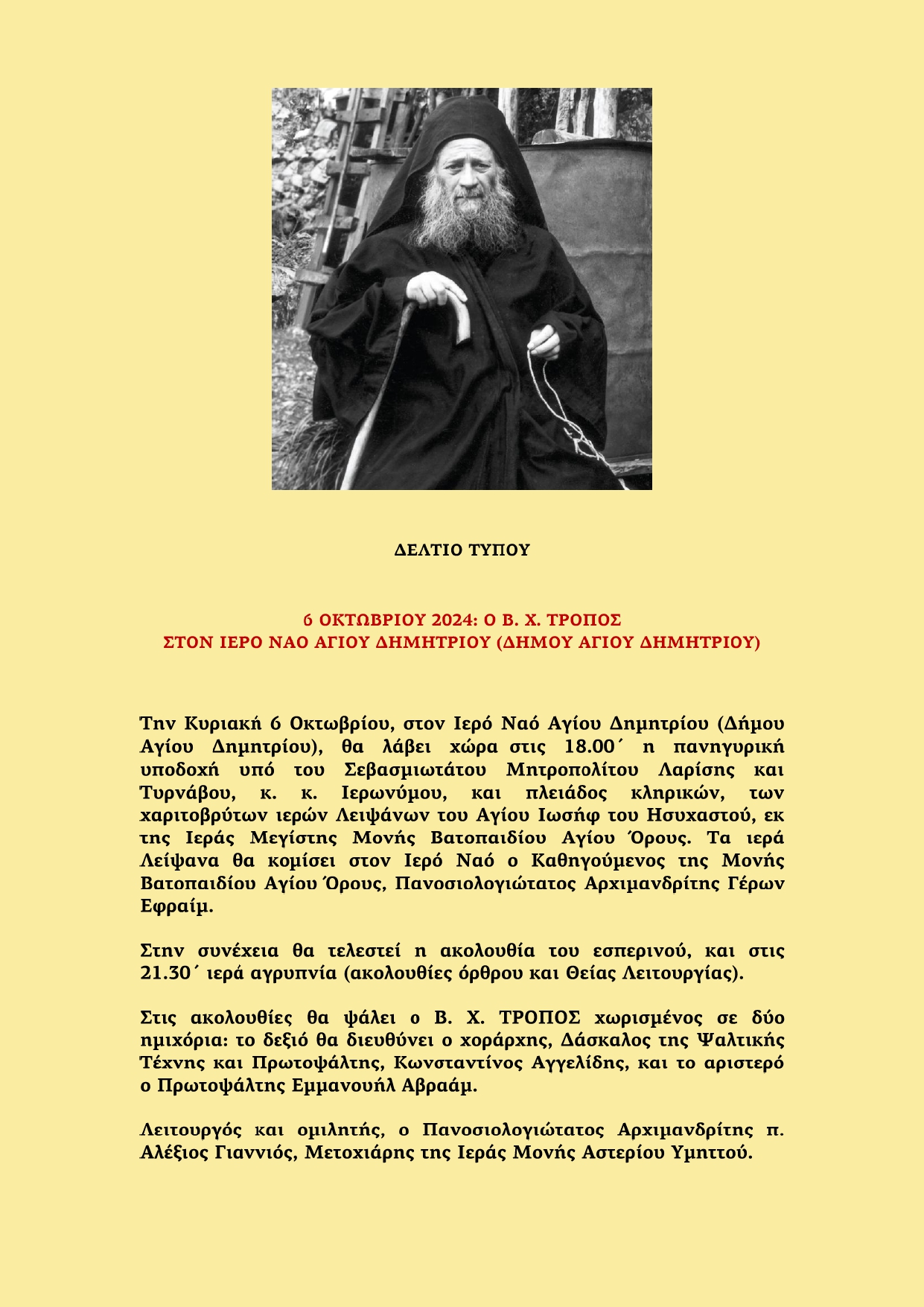 Την Κυριακή 6 Οκτωβρίου, στον Ιερό Ναό Αγίου Δημητρίου (Δήμου Αγίου Δημητρίου), θα λάβει χώρα στις 18.00 η πανηγυρική υποδοχή υπό του Σεβασμιωτάτου Μητροπολίτου Λαρίσης και Τυρνάβου, κ. Ιερωνύμου, και πλειάδος κληρικών, των χαριτοβρύτων ιερών Λειψάνων του Αγίου Ιωσήφ του Ησυχαστού, εκ της Ιεράς Μεγίστης Μονής Βατοπαιδίου Αγίου Όρους. Τα ιερά Λείψανα θα κομίσει στον Ιερό Ναό ο Καθηγούμενος της Μονής Βατοπαιδίου Αγίου Όρους, Πανοσιολογιώτατος Αρχιμανδρίτης Γέρων Εφραίμ.