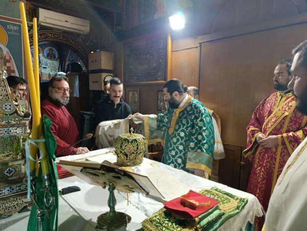 Με το σκήνωμα της Αικατερίνης Σιμιγδαλά – Γαβαλά, αγιογράφου και κατηχήτριας, στο κέντρο του ναού, χοροστάτησε στον όρθρο και προεξήρχε στην Θεία Λειτουργία ο επίσκοπος Ευρίπου Χρυσόστομος, συμπαραστατούμενος από τους αρχιμανδριτες Ευλόγιο Αντωνέλλο, Αρκάδιο Ραζνύ και τον εορτάζοντα Σεραφείμ Δημητρίου, τους νεοχειροτονηθέντες ιερομονάχους Χρυσόστομο Κρητικό και Μελέτιο Κριαρά, τον οικονόμο Γεώργιο Βάρσο και τους διακόνους Πέτρο Τζάρα και Χρήστο Αγγελάκη. Συμπροσευχήθηκαν ο επίσκοπος Βερενίκης Χρυσόστομος, οι αρχιμανδρίτες Ιάκωβος Δελλής, Ρωμανός Φωκάκης, Χρυσόστομος Καλαθάς και Σιλουανός Παπανικολάου καθώς και ο πρωθιερεύς Μιχαήλ Γιαννάτος.