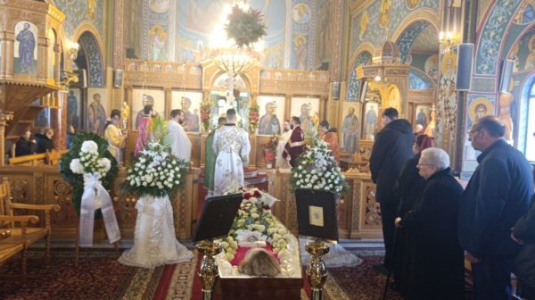 Ακολούθησε η εξόδιος ακολουθία της μακαριστής ενορίτου, με την συμμετοχή και των εφημερίων του ιερού ναού αγίου Νικολάου Ηλιουπόλεως, πρωθιερέων Ιωάννου Κυρλάκη, Παναγιώτου Κούκουνα και Γεωργίου Γιαννόπουλου. Ο πρωτοπρεσβύτερος Παναγιώτης, ως υπεύθυνος νεότητος του ναού αγίου Νικολάου, εκφώνησε επικήδειο, σημειώνοντας την παρουσία νέων παιδιών τα οποία είχε μαθητές στα κατηχητικά σχολεία στα 13 χρόνια όπου η αείμνηστος διηκόνησε ως κατηχήτρια.