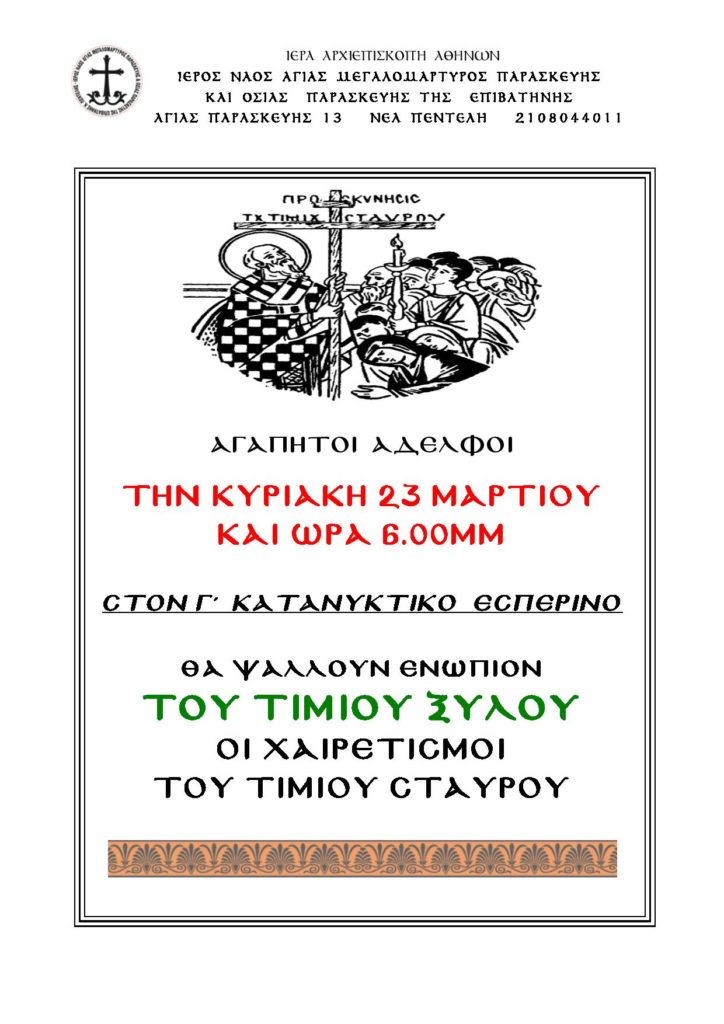 Την Κυριακή 23 Μαρτίου στις 18:00 στον Γ’ Κατανυκτικό Εσπερινό θα ψαλλούν ενώπιον του Τιμίου Ξύλου οι χαιρετισμοί του Τιμίου Σταυρού στον Ιερό Ναό Αγίας Μεγαλομάρτυρος Παρασκευής και Οσίας Παρασκευής της Επιβατινής στη Νέα Πεντέλη.