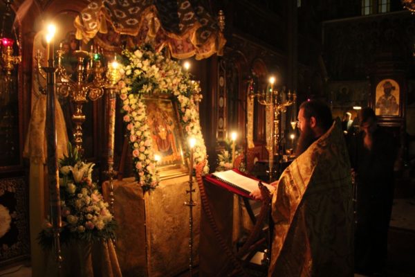 Η ολονυκτία τελέστηκε κατά το αγιορείτικο τυπικό, όπου προηγήθηκε πανηγυρικός Εσπερινός μετά λιτής και αρτοκλασίας. Στον Όρθρο εψάλη μετά πάσης μεγαλοπρεπείας το πλήρες Κοντάκιον της εορτής μετά Χαιρετισμών και ο Ασματικός κανών προς τιμήν της Υπεραγίας Θεοτόκου. Ακολούθως τελέστηκε η πανηγυρική Θεία Λειτουργία κατά το αγιορείτικο τυπικό.