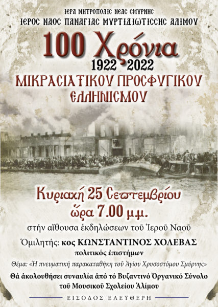 Με αφορμή τη συμπλήρωση 100 ετών από τη «μαύρη» επέτειο της Μικρασιατικής καταστροφής (1922-2022) θα λάβει χώρα στην αίθουσα εκδηλώσεων του Ιερού Ναού Παναγίας Μυρτιδιωτίσσης Αλίμου στις 25 Σεπτεμβρίου 2022 και ώρα 19.00 μ.μ., μία ενδιαφέρουσα ομιλία από τον Πολιτικό Επιστήμονα Κωνσταντίνο Χολέβα, βαθύ γνώστη της Εκκλησιαστικής Ιστορίας.