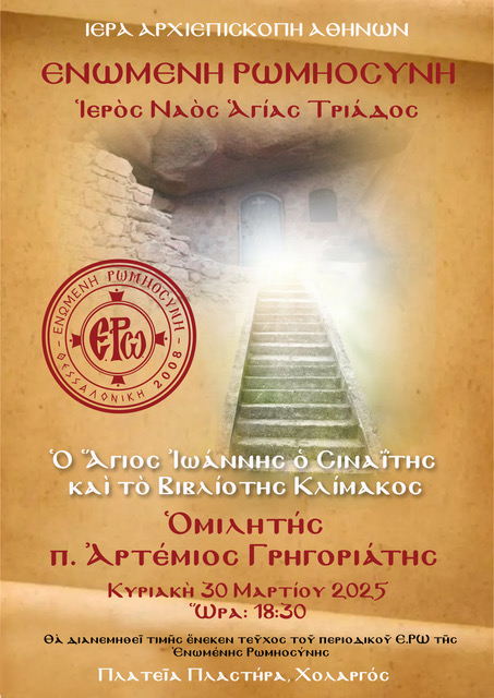 Ομιλία με θέμα: “Ο Άγιος Ιωάννης ο Σιναϊτης και το βιβλίο της Κλίμακος” θα πραγματοποιηθεί την Κυριακή 30 Μαρτίου 2025, και ώρα 18:30 στον ιερό ναό Αγίας Τριάδος Χολαργού, στην Αθήνα.
