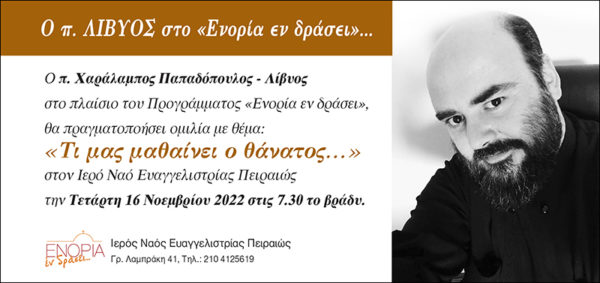 Ομιλία με θέμα “Τι μας μαθαίνει ο θάνατος” θα πραγματοποιήσει ο π. Λίβυο (Χαράλαμπος Παπαδόπουλο), στο πλαίσιο του προγράμματος “ΕΝΟΡΙΑ εν δράσει“. Η ομιλία θα πραγματοποιηθεί την Τετάρτη 16 Νοεμβρίου 2022, στις 7.30 το βράδυ, στον Ιερό Ναό Ευαγγελιστρίας Πειραιώς.