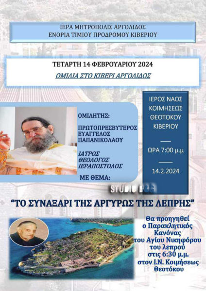 Το Εκκλησιαστικό Συμβούλιο της Ενορίας Τιμίου Προδρόμου Κιβερίου διοργανώνει ομιλία την Τετάρτη 14 Φεβρουαρίου 2024. Στις 6:30 μ.μ. στον Ιερό Ναό Κοιμήσεως Θεοτόκου Κιβερίου θα ψαλλεί η ακολουθία του Παρακλητικού κανόνα προς τον Όσιο Νικηφόρο το λεπρό και στην συνέχεια θα ακολουθήσει ομιλία με θέμα: “Το συναξάρι της Αργυρώς της λεπρής” από τον Πρωτοπρεσβύτερο π. Ευάγγελο Παπανικολάου θεολόγο, ιατρό και ιεραπόστολο.