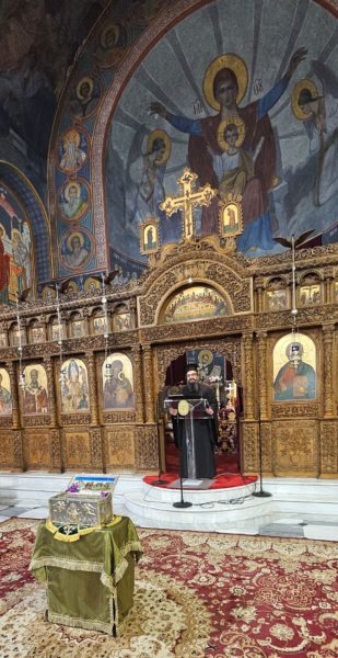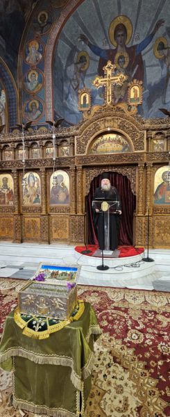 Κατά τη διάρκεια του Ιερού Αποδείπνου τέθηκε προς προσκύνηση το τεμάχιο της Τιμίας Ζώνης της Παναγίας, που φυλάσσεται στην Ιερά Μονή Παναγίας Κάτω Ξενιάς.