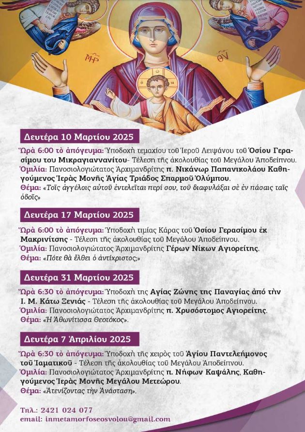 Στο πλαίσιο της ποιμαντικής μέριμνας της Τοπικής Εκκλησίας για την πνευματική τροφοδοσία του λαού, κατά την Αγία και Μεγάλη Τεσσαρακοστή, στον Ιερό Ναό Μεταμορφώσεως του Σωτήρος Βόλου, εκάστη Δευτέρα αυτής της περιόδου, πραγματοποιούνται ομιλίες πνευματικής οικοδομής, από εκλεκτούς προσκεκλημένους, προς τούτο, ομιλητές. Έτσι, χθες 31/3, μετά την Ακολουθία του Μεγάλου Αποδείπνου, ο Γέρων Χρυσόστομος από το Άγιον Όρος, ο οποίος ανέπτυξε το θέμα «Η ΑΘΩΝΙΤΙΣΣΑ ΘΕΟΤΟΚΟΣ»..