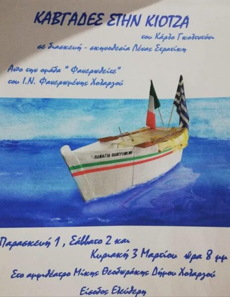 Η θεατρική ομάδα “Φανερωθείτε” του Ι.Ν. Φανερωμένης Χολαργού ανεβάζει το έργο “ΚΑΒΓΑΔΕΣ ΣΤΗΝ ΚΙΟΤΖΑ” του Κάρλο Γκολντόνι σε διασκευή – σκηνοθεσία της Λένας Στρατίκη, κατά την Παρασκευή 1, Σάββατο 2 και Κυριακή 3 Μαρτίου, ώρα 8.00 μ.μ., στο Αμφιθέατρο Μίκης Θεοδωράκης του Δήμου Χολαργού – Είσοδος Ελεύθερη.