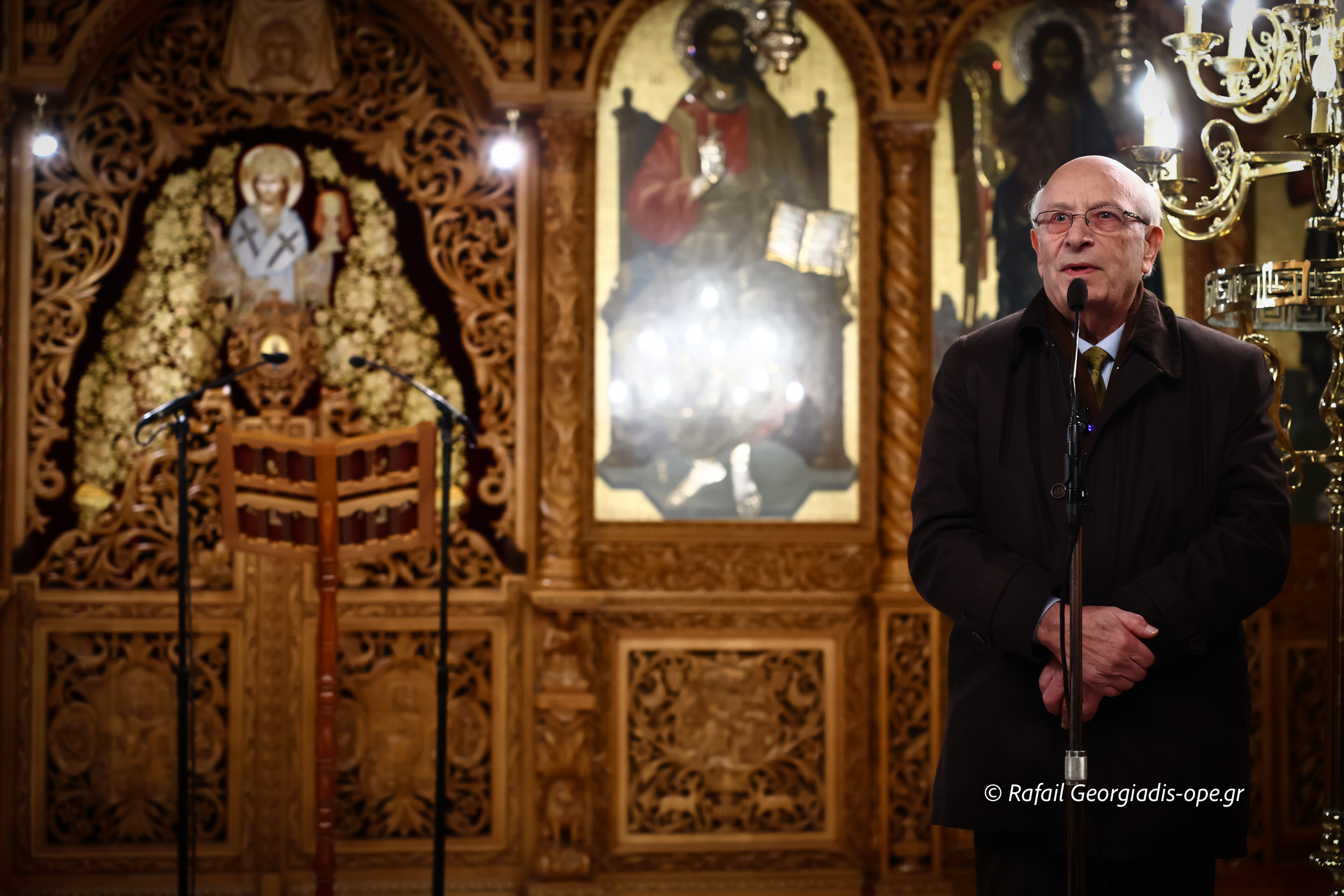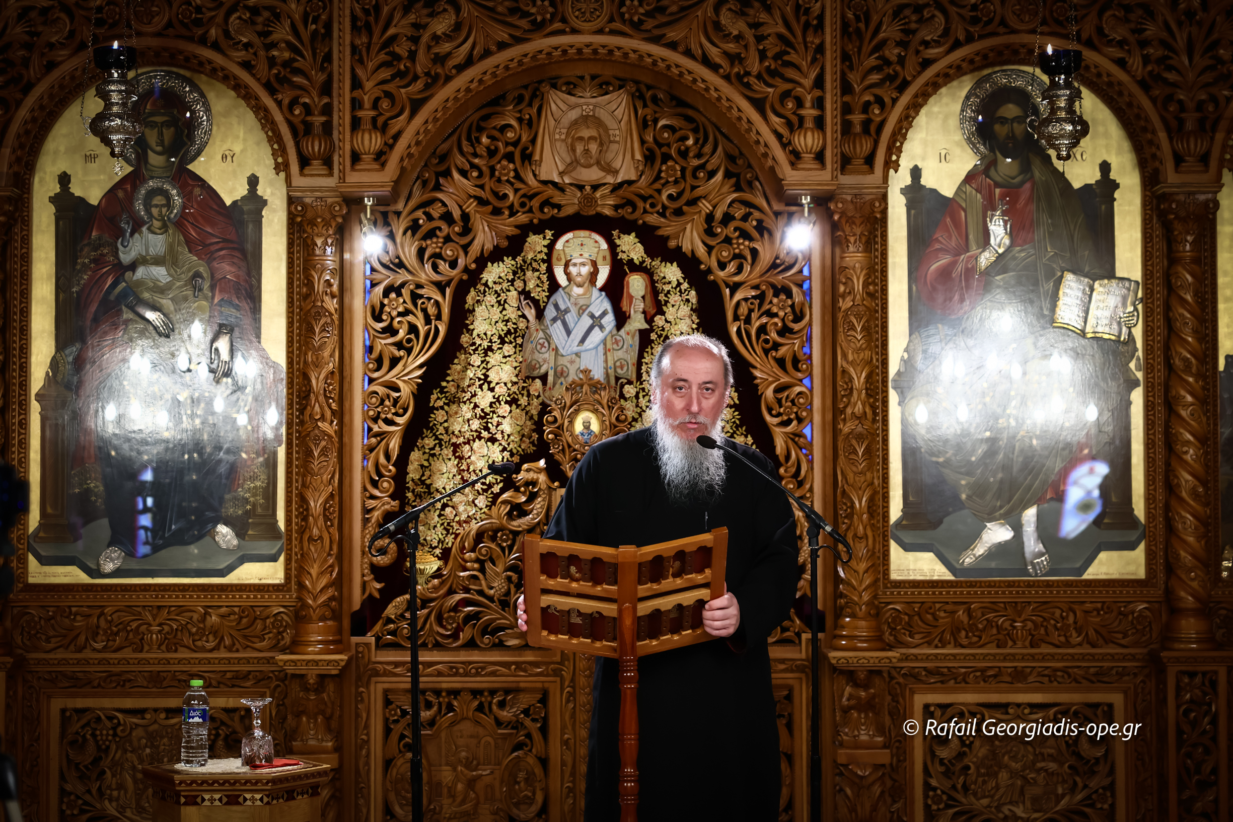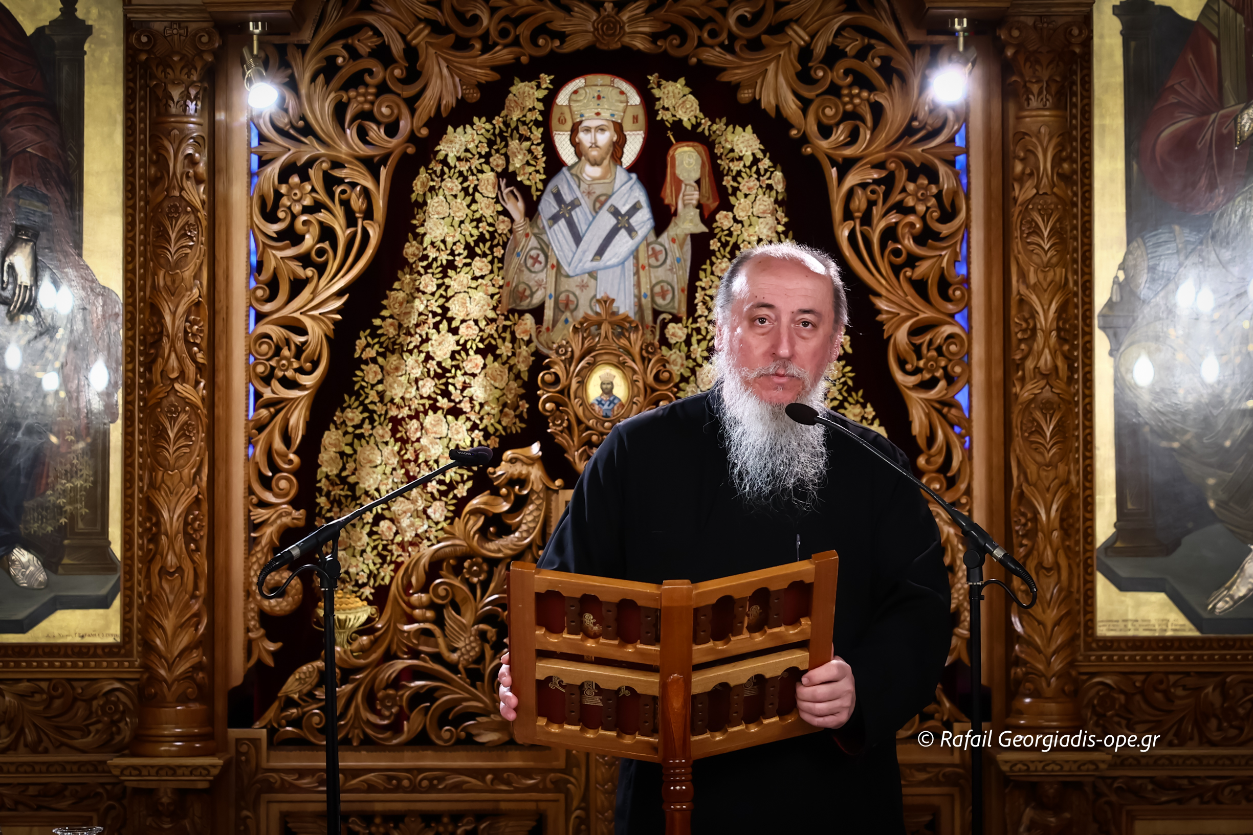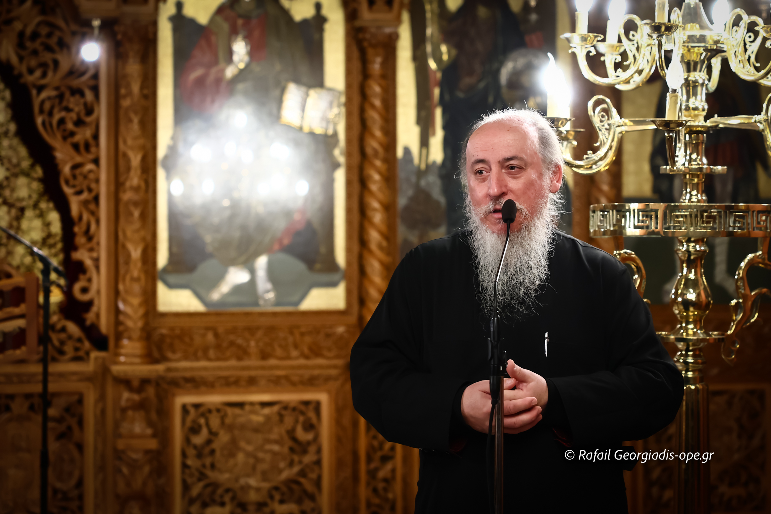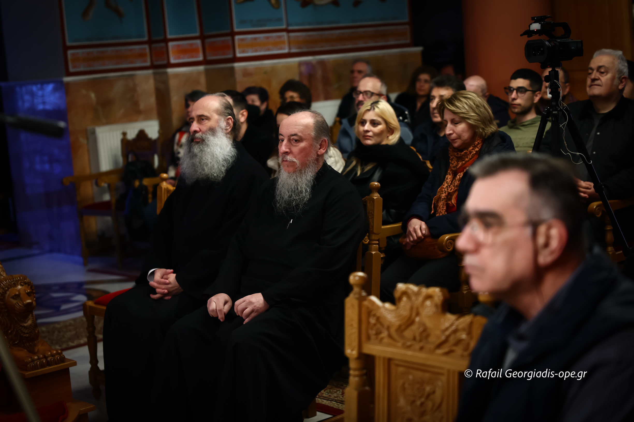 Την εκδήλωση προλόγισε ο προϊστάμενος του ναού, Πρωτοπρεσβύτερος π. Αλέξιος Παπαστεργίου, ο οποίος καλωσόρισε θερμά τον εκλεκτό προσκεκλημένο και αναφέρθηκε στη σημαντική μαρτυρία που φέρει για τον Άγιο Παΐσιο, καθώς υπήρξε ο κληρικός που τον κοινωνούσε κατά τα τελευταία χρόνια της ζωής του και εκείνος που τέλεσε την εξόδιο ακολουθία του Αγίου.