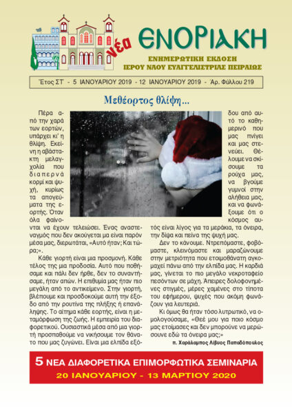 Κυκλοφορεί η ΝΕΑ ΕΝΟΡΙΑΚΗ (5 Ιανουαρίου – 12 Ιανουαρίου 2020) του Ιερού Ναού Ευαγγελίστριας Πειραιώς, με κείμενο του π. Χαραλάμπου Παπαδόπουλου (Λίβυος), στην πρώτη σελίδα της, υπό τον τίτλο: “Μεθέορτος θλίψη…”.
