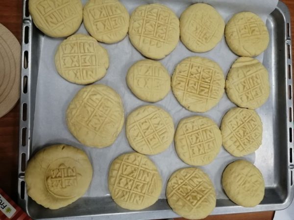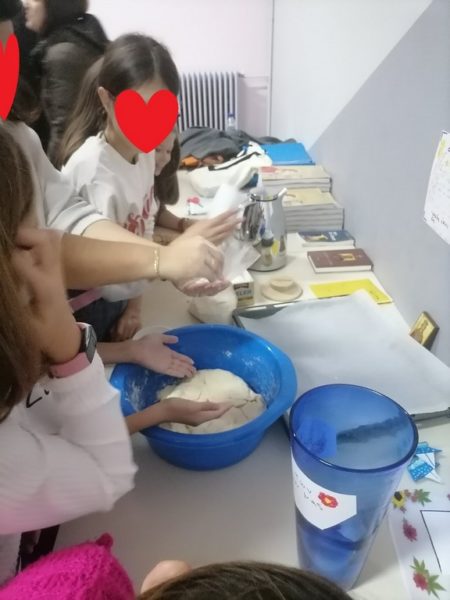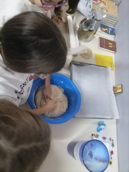 Με την καθοδήγηση των έμπειρων κατηχητριών, αγόρια και κορίτσια των τελευταίων τάξεων του Δημοτικού, προετοίμασαν τα υλικά, προσευχήθηκαν, αναπιάσαν το προζύμι, προσθέσαν το αλεύρι, ζύμωσαν και έψησαν τις δικές τους “λειτουργιές” όπως συνήθως τις λέμε… για να αποδοθούν ως προσφορά για τη λατρεία του Θεού μας.