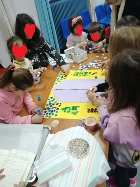 Τα μικρά κατηχητόπουλα έμαθαν για τους συμβολισμούς της σφραγίδας του προσφόρου, μέσα από ένα μεγάλο κολάζ, όπου όλοι συμμετείχαν επικολλώντας επάνω του μικρές ψηφίδες.