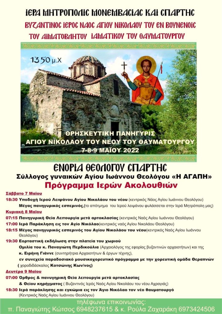 Ιερά Πανήγυρη Αγ. Νικολάου του νέου εν Βουνένοις του αιματοβλύτου Ιαματικού του Θαυματουργού πραγματοποιείται το τριήμερο 7 -8-9 Μαΐου, από την Ενορία θεολόγου Σπάρτης και τον Σύλλογο Γυναικών Αγίου Ιωάννου του Θεολόγου “Η ΑΓΑΠΗ”, στον βυζαντινό Ναό του Αγίου Νικολάου Αχραγιά.