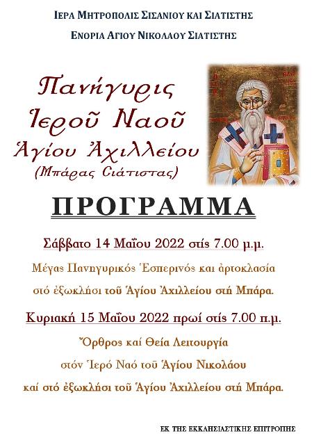 Πανηγυρίζει ο Ιερός Ναός Αγίου Αχιλλείου στη Μπάρα Σιάτιστας το Σάββατο 14 Μαΐου και την Κυριακή 15 Μαΐου.