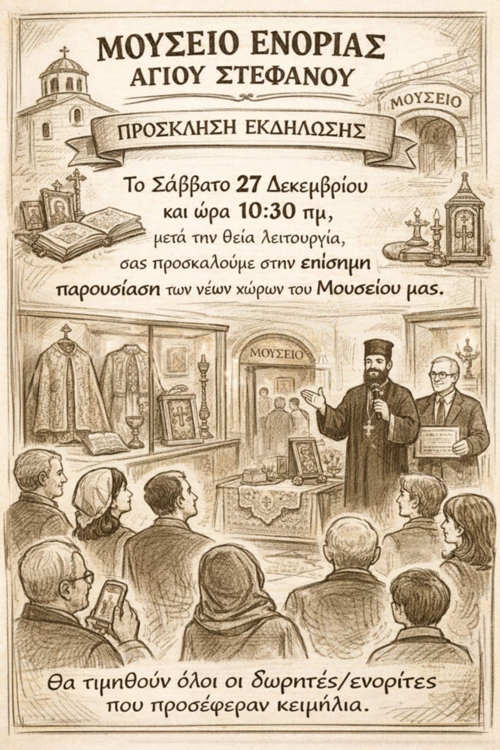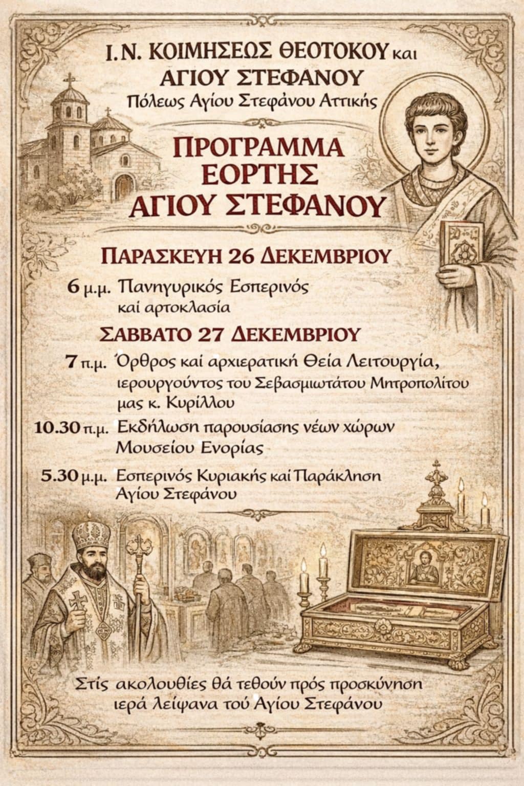 23/12/2025 23/12/2025 Στις 27 Δεκεμβρίου, ημέρα κατά την οποία η Εκκλησία μας τιμά τη μνήμη του Αγίου Πρωτομάρτυρος Στεφάνου, εορτάζει ο Ι.Ν. Κοιμήσεως της Θεοτόκου και Αγίου Στεφάνου, Αγίου Στεφάνου Αττικής. Μετά το πέρας των Ιερών Ακολουθιών, το πρόγραμμα των οποίων παρατίθεται παρακάτω, η ενορία απευθύνει κάλεσμα στην επίσημη παρουσίαση των νέων χώρων του Μουσείου της.