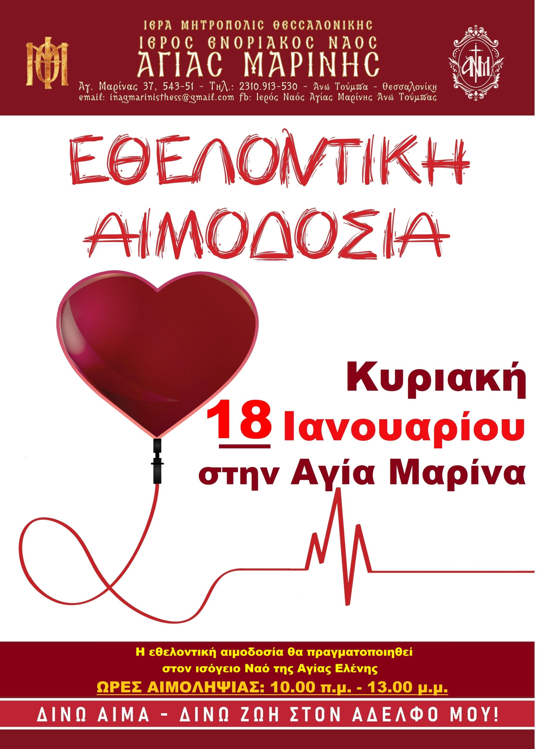 Τέλος, απευθύνεται θερμή έκκληση για συμμετοχή στην εθελοντική αιμοδοσία που διοργανώνουμε στο Ναό την Κυριακή 18 Ιανουαρίου, 10.00 π.μ. – 1.00 μ.μ., καθώς οι ανάγκες των αδελφών σε αίμα είναι πολύ μεγάλες.