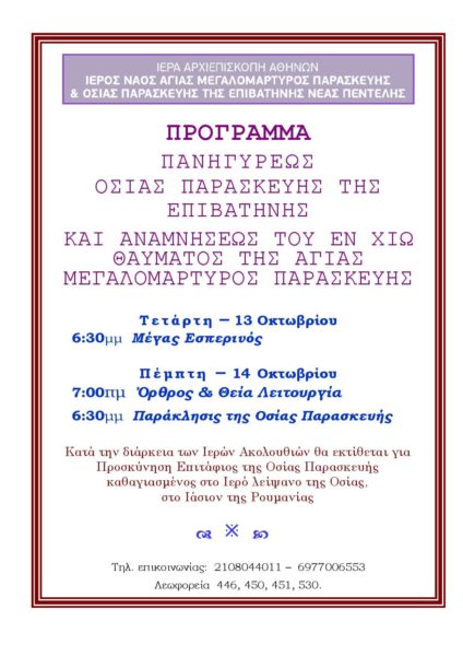 Κατά τη διάρκεια των Ιερών Ακολουθιών, που θα δείτε στο επισυναπτόμενο πρόγραμμα, θα εκτίθεται για Προσκύνηση Επιτάφιος της Οσίας Παρασκευής καθαγιασμένος στο Ιερό λείψανο της Οσίας στο Ιάσιο της Ρουμανίας.